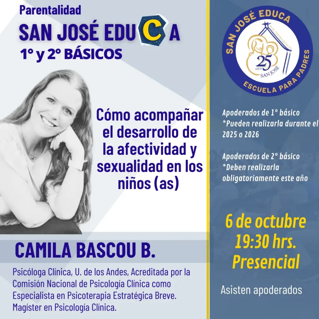 Queridos apoderados de Primero y Segundo básico: El día lunes 06 de octubre, a las 19:30 hrs. en el comedor de nuestro colegio, tendremos nuestra charla sobre “Cómo acompañar el desarrollo de la afectividad y sexualidad en los niños y niñas”, la que se enmarca dentro del programa de habilidades parentales San José Educa. Esta […]