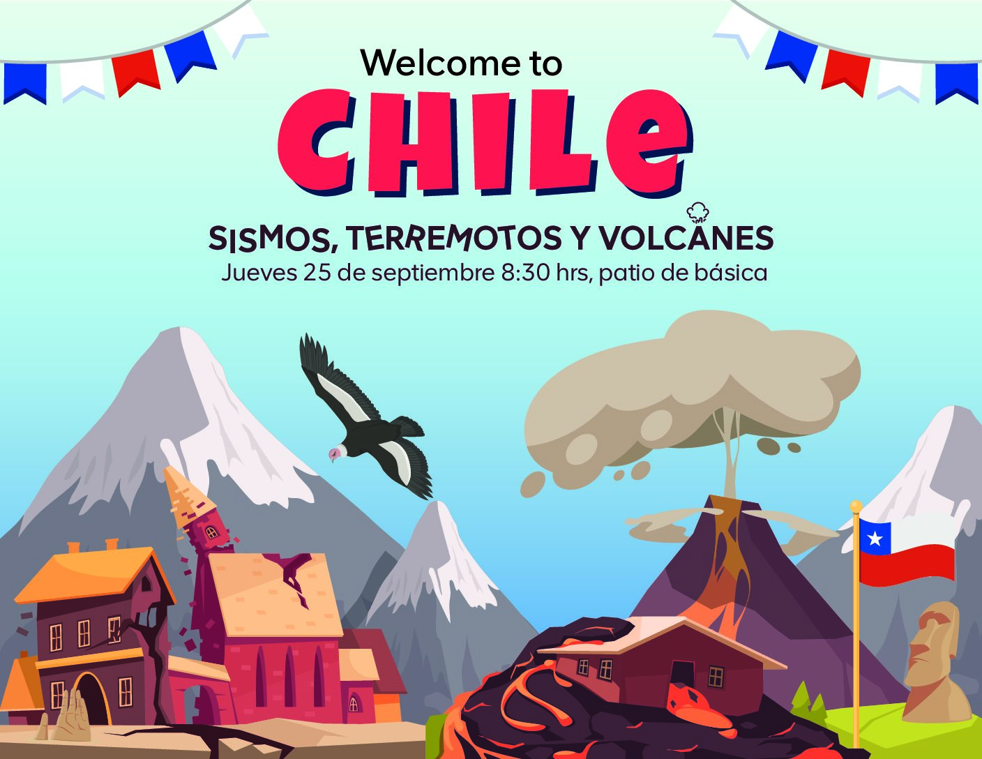 Los invitamos a la presentación del proyecto científico de 7° básico «Welcome to Chile». La actividad se llevará a cabo el jueves 26 de septiembre en el patio gruta del colegio, desde las 8:20 hasta las 8:55 hrs.